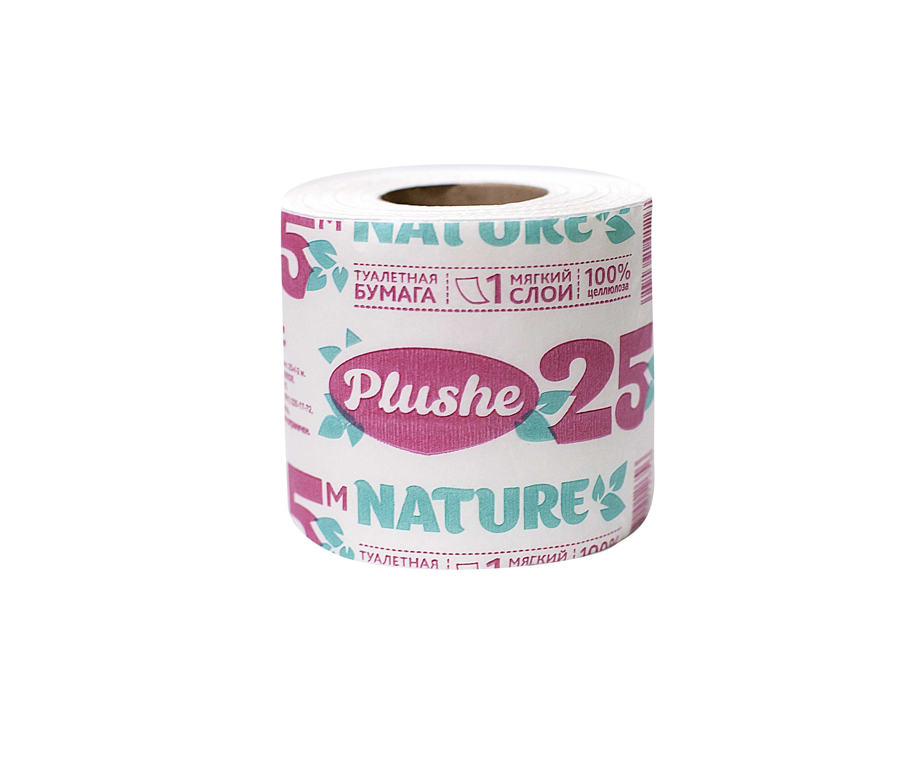 Туалетная бумага Plushe Nature,25 м,втулка, 1 слой, белая, 10 в упак. 100% целлюлоза