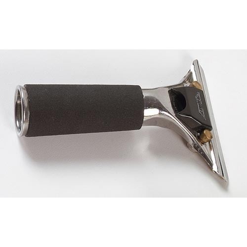 Одна из подобных моделей — стальная рукоять для желоба с замком и прорезиненным обкладом. Инструмент выпускается из нержавеющей стали, что обеспечивает ему максимальную конструктивную надежность и долговечность. Держатель стяжки имеет замок, плотно и прочно фиксирующий желоб, а также удобную прорезиненную ручку. По своим размерам рукоятка универсальна — ее можно использовать в комплекте со всеми желобами марки Ettore, а также с любой моделью телескопического шеста этого бренда в случае, если речь идет о мойке высоких витрин, окон и т. д.