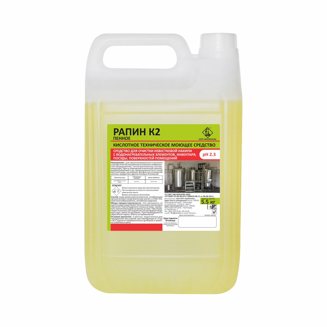 Флореаль: Рапин К2 (Н) 5,5кг Моющее средство для удаления минеральных и органических загрязнений