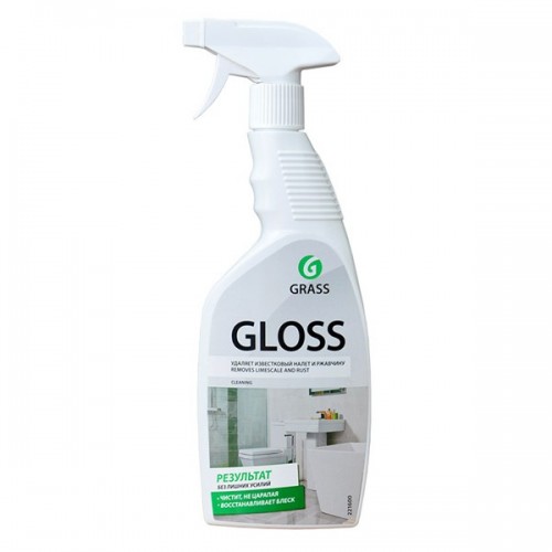 Чистящее средство для ванной комнаты Gloss (Глосс). Средства для уборки линейки Gloss от известкового налета, потеков ржавчины, мыльных разводов и солевых отложений. Чистящее средство grass Gloss эффективно удаляет сложные и застарелые загрязнения. Безопасное средство для акриловых ванн, работает как отбеливатель. Придает поверхности чистоту и блеск, сохраняя эффект на несколько дней. На поверхностях, чувствительных к кислоте, держать не более 30 секунд.