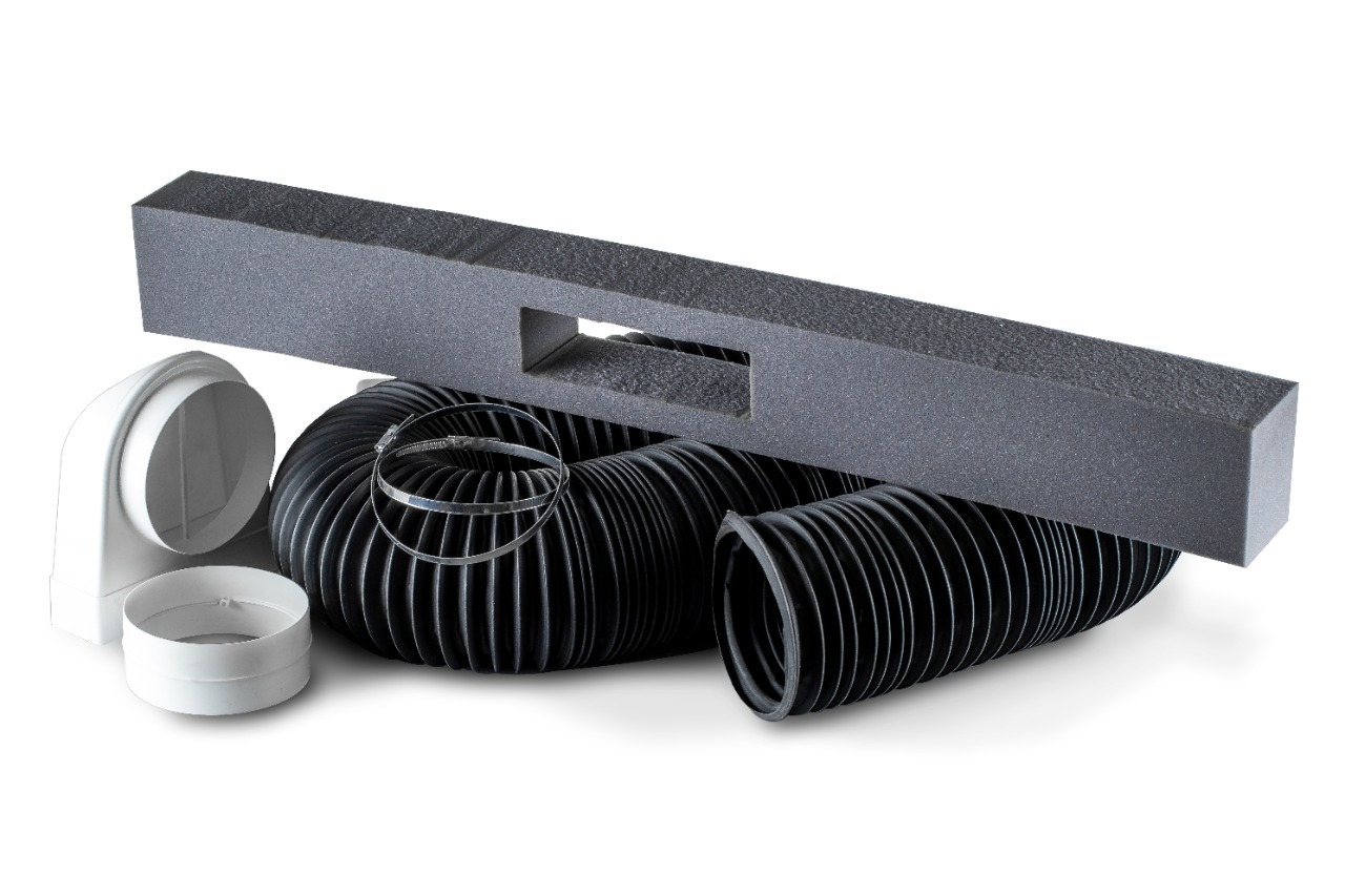 В комплект входят: гофр усиленный длиной 3м., муфта, уголок 90°, хомут 2 шт и уплотнение стекла.