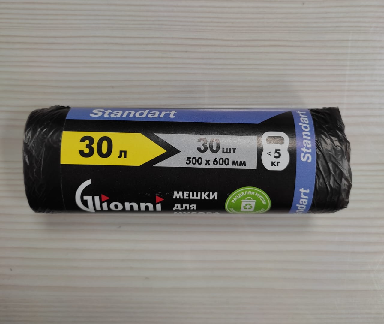 Мешки для мусора: 30л Standart Glionni ПНД, черные, 7мкм, 60*50см, 30шт/рул, 50рул/уп