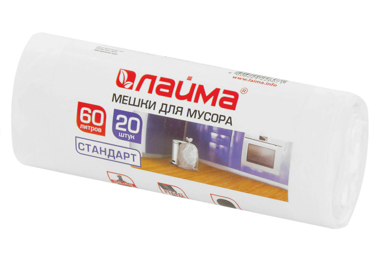 Изготовлены из полиэтилена низкого давления (ПНД) плотностью 7 микрон и имеют объем 60 литров. Размер мешка - 58х68 см (±5%). Поставляются в белом цвете в рулоне по 20 штук. Преимуществами данных мешков для мусора являются: высокая грузоподъемность.