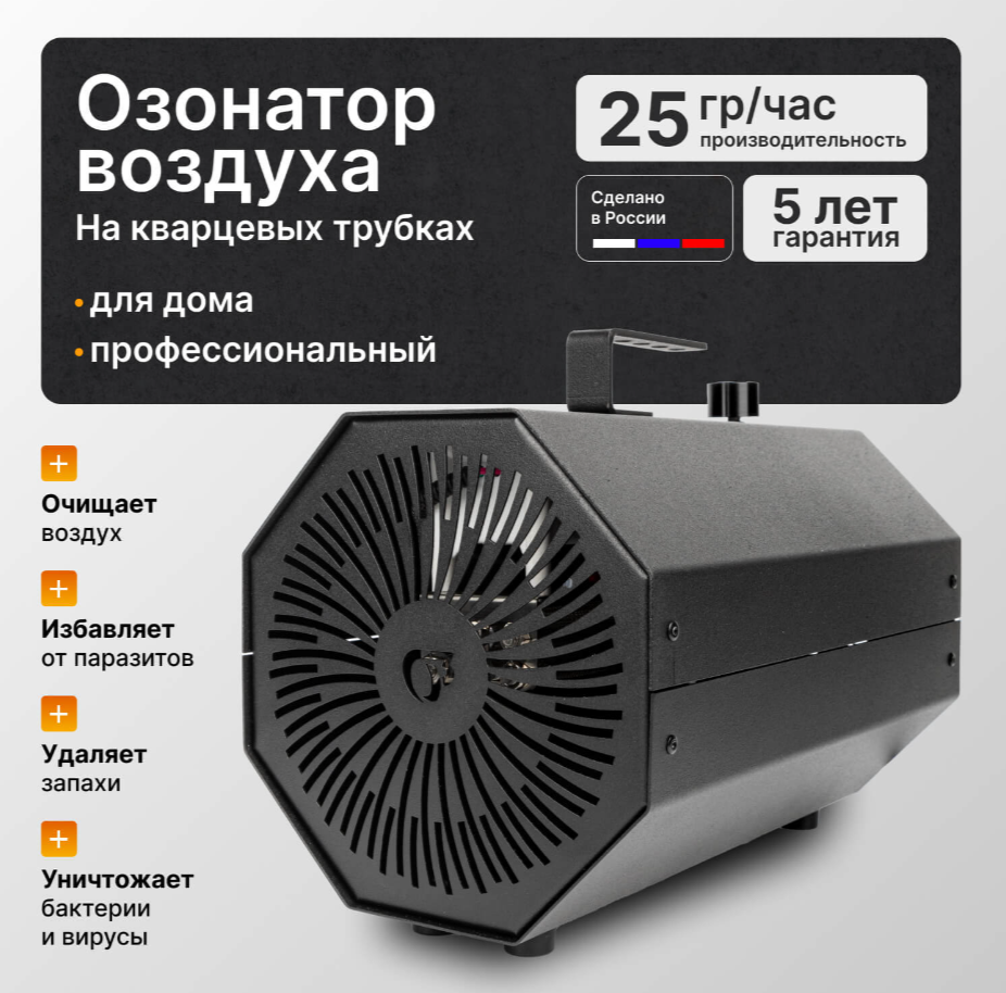 1. Высокая эффективность: Озонатор генерирует 25 грамм озона в час, обеспечивая эффективную обработку воздуха в короткие сроки.
