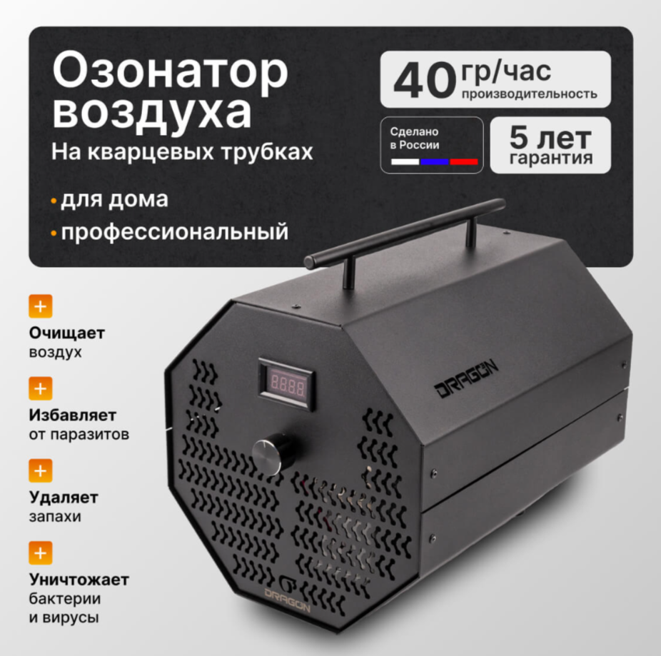 1. Высокая производительность: Озонатор генерирует 40 грамм озона в час, обеспечивая эффективную обработку воздуха в короткие сроки.