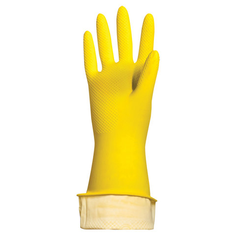 Перчатки изготовлены из прочного латексного материала. Классический размер M подойдет на руку стандартного размера. В комплекте 1 пара. Внутреннее легкое хлопковое напыление (фактически это нанесение хлопковой пудры для того чтобы исключить слипание перчатки) обеспечивает защиту рук от воздействия внешних факторов (получение царапин или раздражения от контакта с химическими растворами). Рельефная поверхность препятствует скольжению предметов. Данные перчатки можно использовать несколько раз. Тип манжеты: закатанный край. Нельзя использовать при работе с растворителями и электрическим током.
