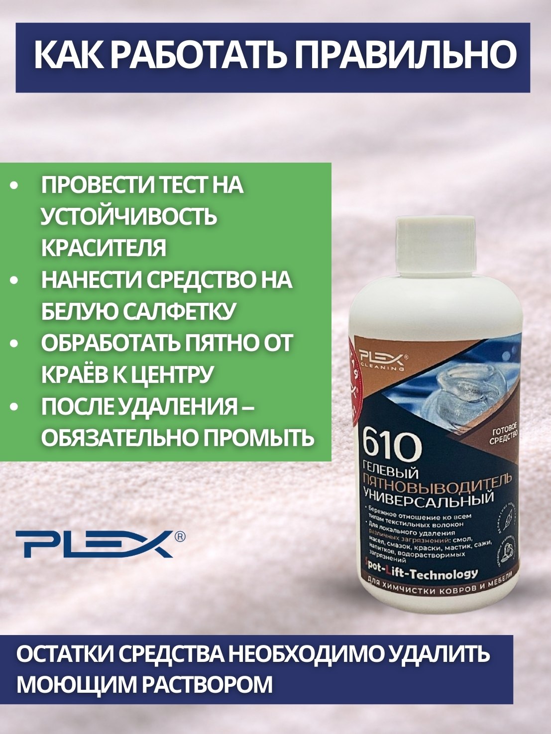 ПРИМЕНЕНИЕ: Проведите предварительный тест на устойчивость красителя. Средство готово к использованию. Нанесите пятновыводитель на чистый белый кусок ткани и удалите пятно от краев к центру. Обязательно удалите остатки пятновыводителя с поверхности путем очистки моющим средством. Дайте поверхности высохнуть.