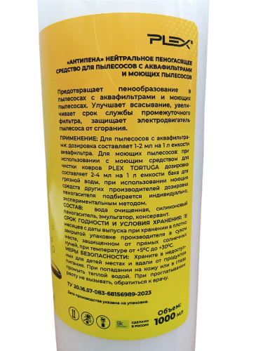Для пылесосов с аквафильтрами: дозировка составляет 1-2 мл. на 1 л. ёмкости аквафильтра. Для моющих пылесосов при использовании с моющим средством для чистки ковров PLEX TORTUGA дозировка составляет 2-4 мл. на 1л. ёмкости бака для грязной воды, при использовании моющих средств других производителей дозировка пеногосителя подбираются индивидуально, экспериментальным методом.