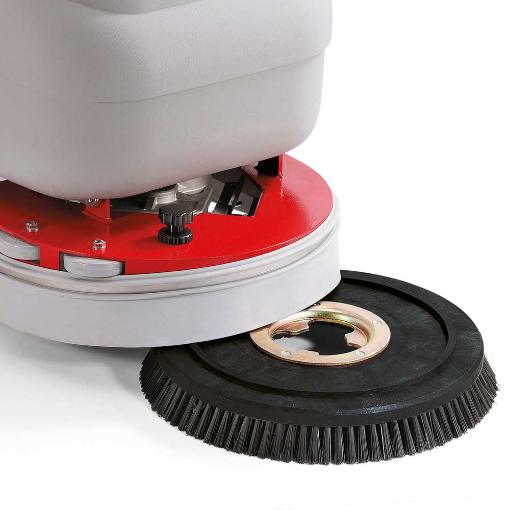 Щеточная головка регулируется по высоте и легко поднимается нажатием педали для безопасной транспортировки.
