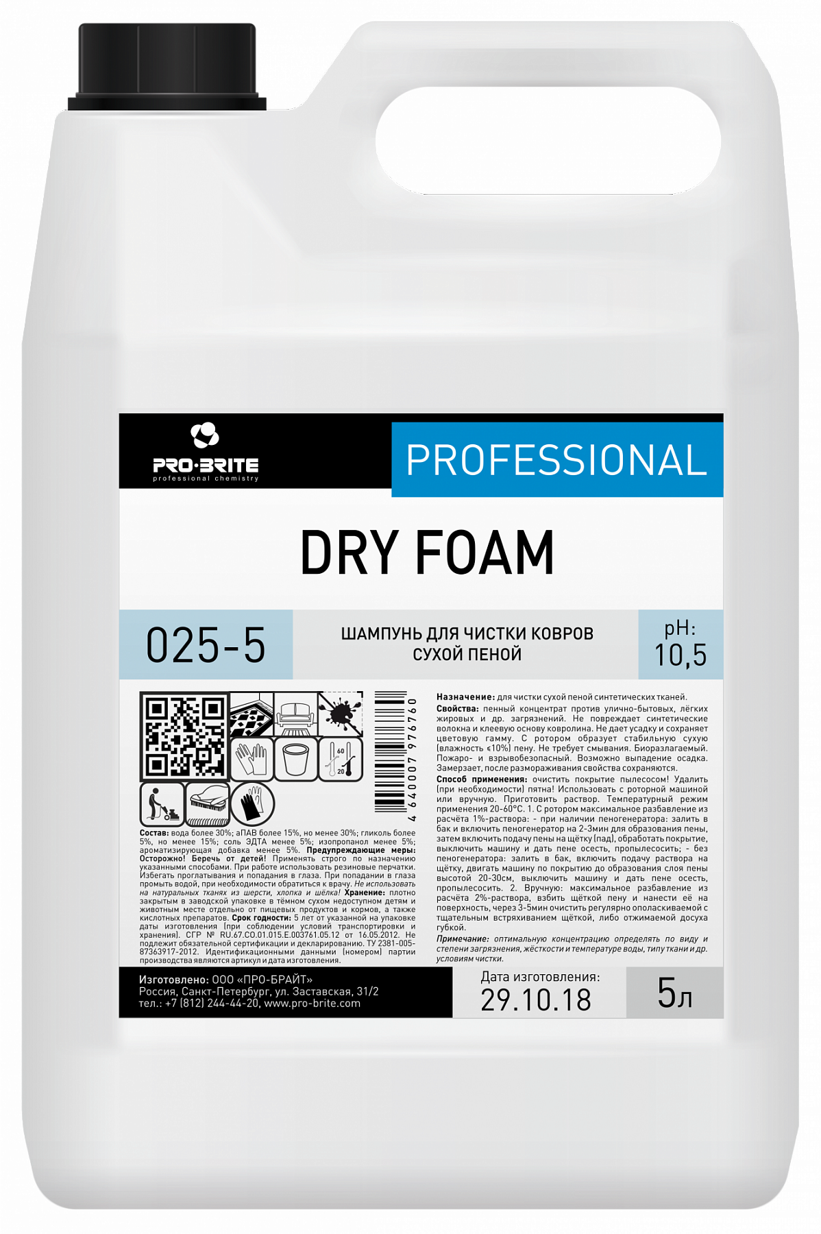 Pro-Brite: Dry foam 5л./4шт Шампунь для чистки ковров сухой пеной.