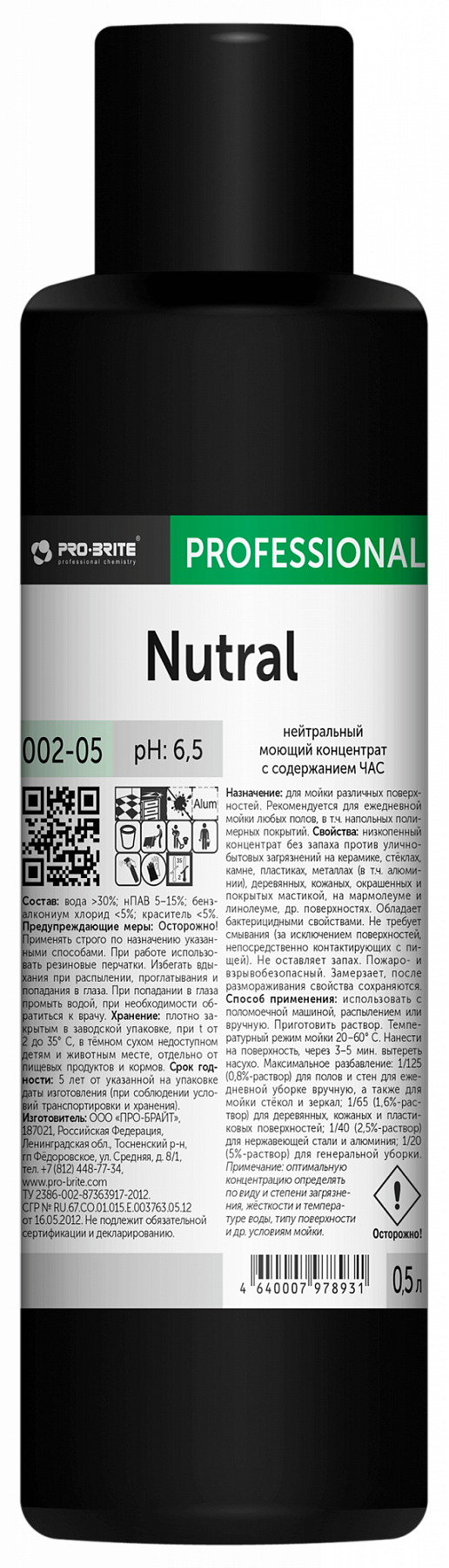 Pro-Brite: NUTRAL, 0,5л./12шт Нейтральный моющий концентрат с содержанием ЧАС