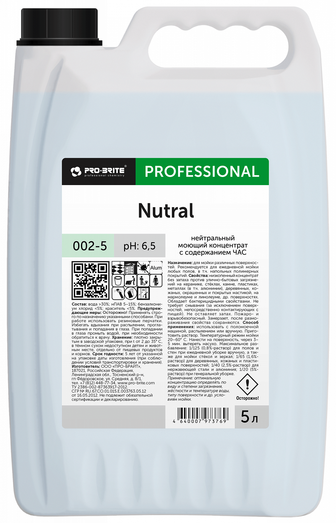 Pro-Brite: NUTRAL, 5л./4шт Нейтральный моющий концентрат с содержанием ЧАС