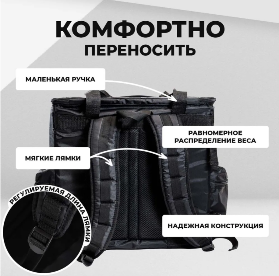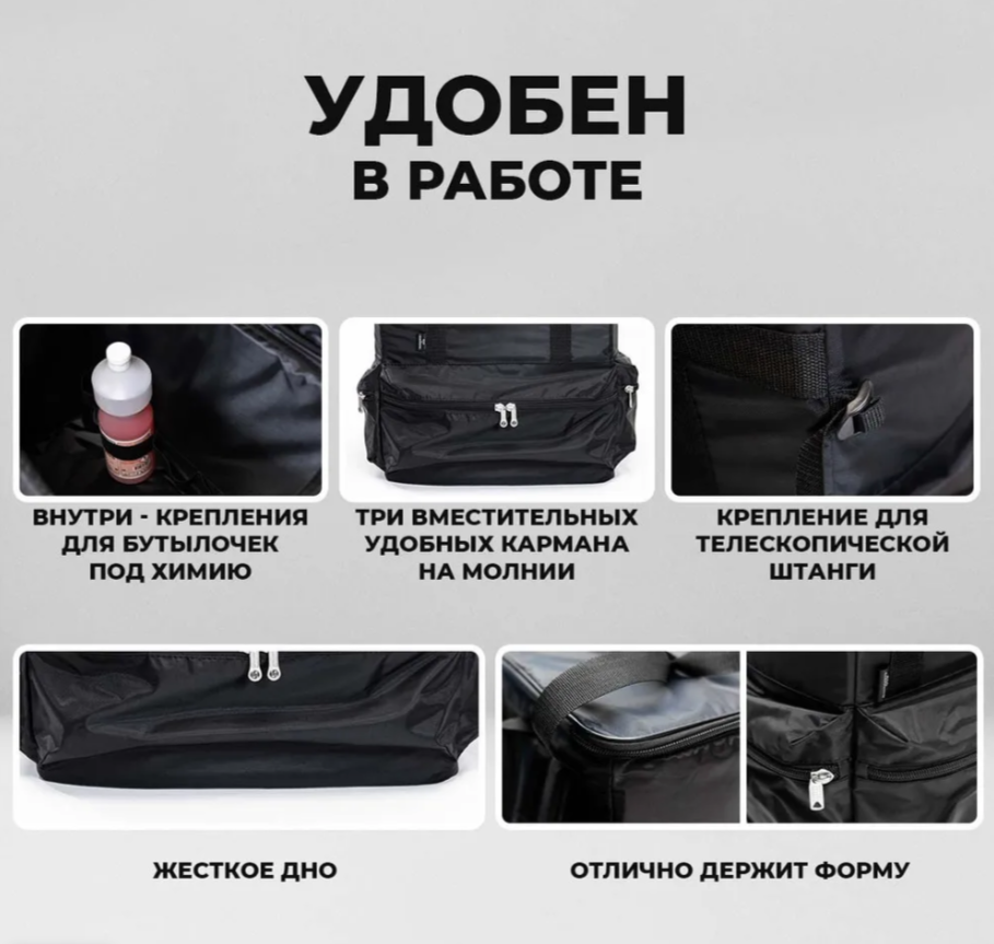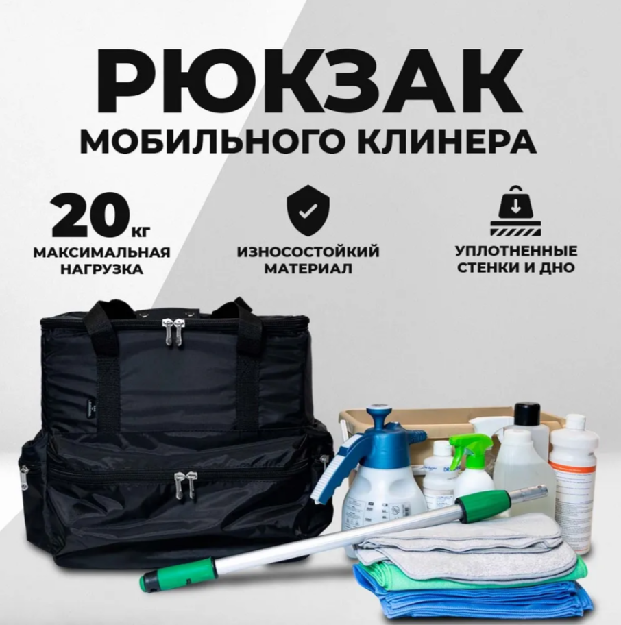 Рюкзак снабжен дополнительными атрибутами. Они делают изделие намного более износоустойчивыми и удобными в эксплуатации. В швах соединения и по периметру крышки изделия вшит кедер (кант из эластичного пластика) – для поддерживания формы, прочности и эстетичного вида. С трех сторон имеются удобные кармашки для мелочей и крепление для телескопической штанги. Рюкзак имеет эргономичную форму, что исключает неудобство при передвижении.Лямки имеют трехслойную конструкцию: основная ткань с лицевой стороны, внутри прослойка из мягкой «пенки», изнаночная сторона – воздухопроницаемая мелкая сетка. Такая особенность пошива делает ношение рюкзака комфортным, не натирает плечи – даже несмотря на вес содержимого. К слову, спинка тоже мягкая, что создает дополнительное удобство во время переноски. Помимо удобных лямок, у рюкзака есть короткие ручки с липучками. Внутренняя часть рюкзака оснащена отсеками на резинках для флаконов под химию.