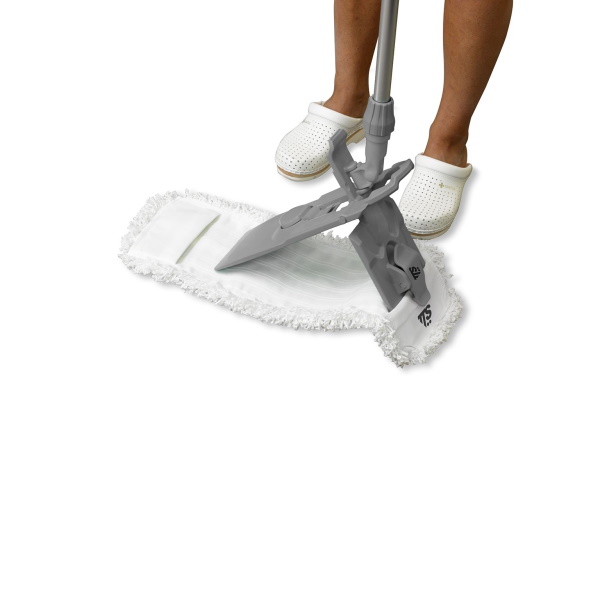 Для снятия мопа с держателя во время уборки, необходимо лишь нажать на клавишу ногой, после чего держатель складывается пополам. Мопы с данным держателем можно отжимать в тележка с отжимом.
