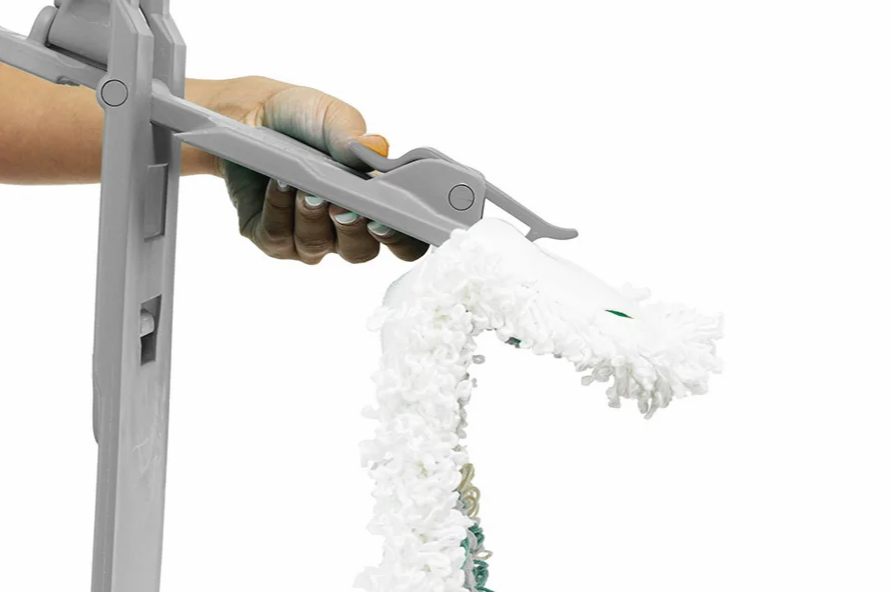 Универсальное шарнирное крепление ручки обеспечивает комфортную уборку под мебелью и углах - оно вращается на 360°, а также позволяет использовать с данным держателем любую ручку диаметром от 20 до 23 мм. Также на креплении установлен фиксатор положения держателя для уборки вертикальных поверхностей.