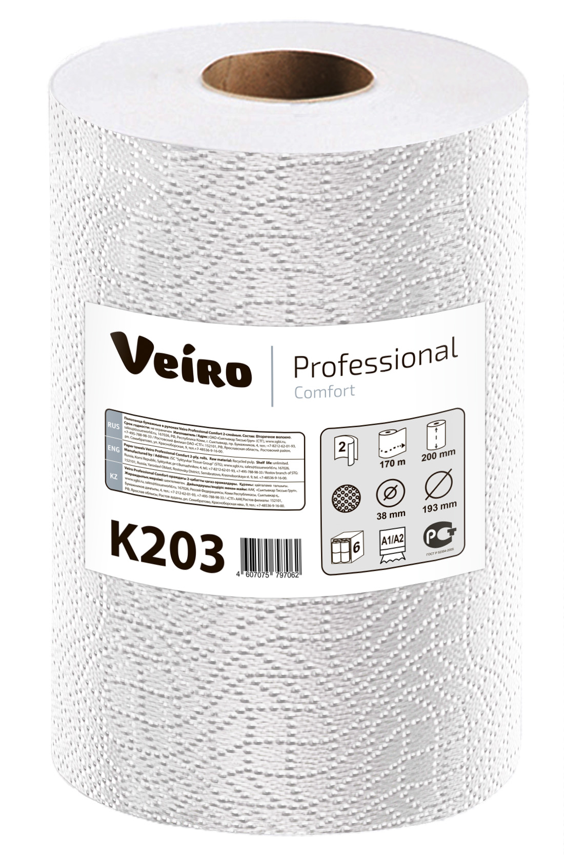 VEIRO: Рулонные полотенца Professional Comfort, 150м.,шир 200мм.,6рул*упак.,вт38мм.