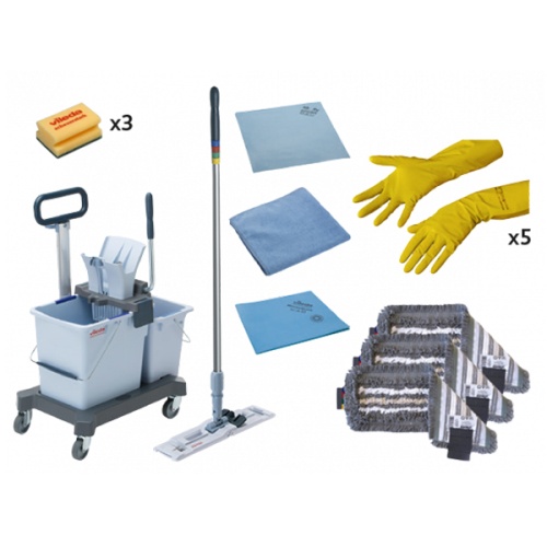 Стандартный комплект инвентаря для уборки на базе высокоэффективной двухведерной системы УльтраСпид Про. Предназначен для уборки внутри помещений с площадью до 500 кв. м. Уборка пола на базе ведер и швабр со сменными мопами, а также протирка и очистка вертикальных и горизонтальных поверхностей от ежедневных загрязнений.