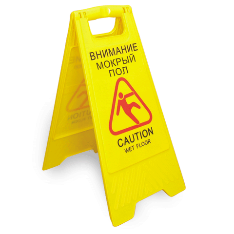 Знак «Влажный пол» изготовлен из ударопрочного пластика, имеет яркий жёлтый цвет. Его конструкция является прочной и устойчивой